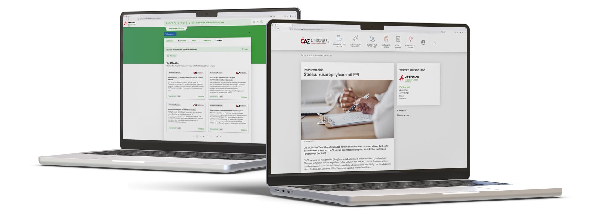 In Fachartikeln auf oeaz.at werden relevante Arzneistoffe automatisch angezeigt. Ein Klick führt direkt zur passenden Fachinformation im Austria-Codex Online mit Informationen zur Anwendung, Sicherheit und vielem mehr. Die Verlinkung unterstützt eine schnelle Vertiefung bei konkretem Informationsbedarf.