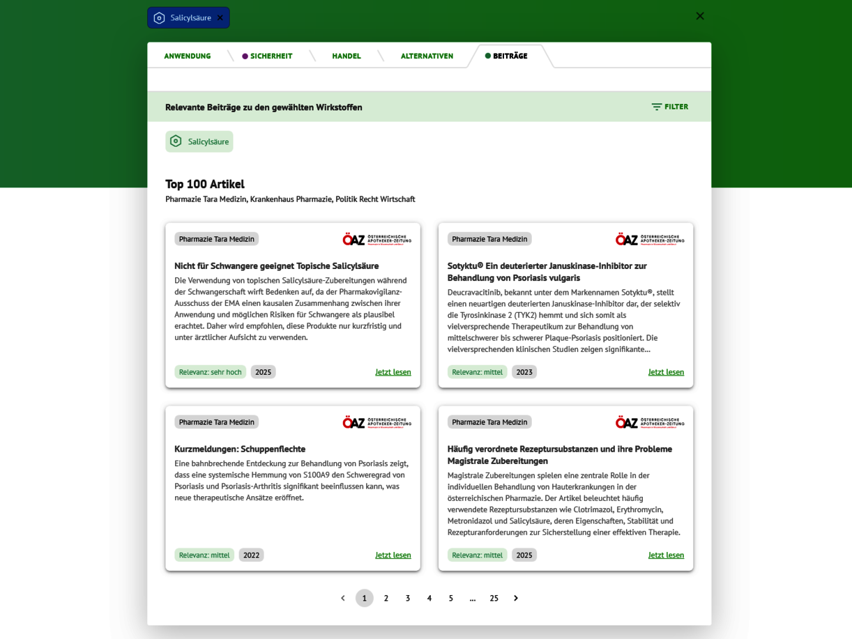 Der Austria-Codex Online findet über die ausgewählten Wirkstoffe passende Artikel auf oeaz.at und zeigt diese mit Kurzbeschreibung im Bereich „Beiträge“. Alle Artikel sind unterteilt sowie filterbar nach „Relevanz“ (zur Wirkstoffauswahl) und „Erscheinungsjahr“. Wer tiefer einsteigen will, wechselt direkt zum Artikel auf oeaz.at – als PDF oder online.
